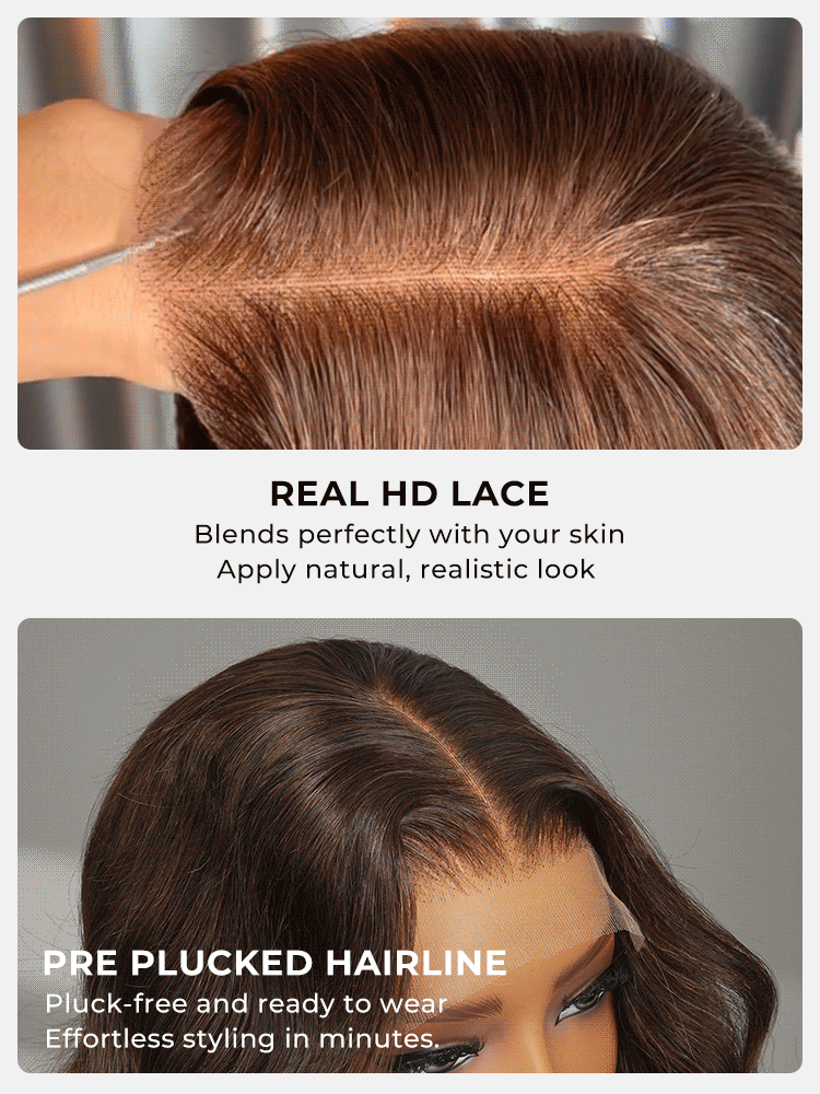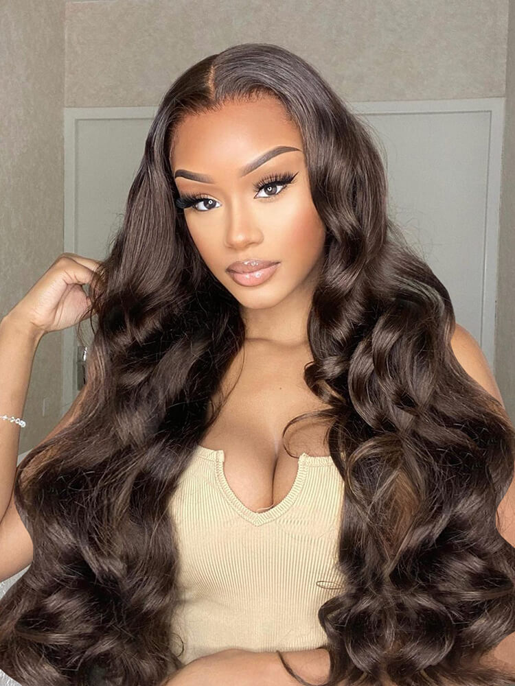 Top grade double drawn body wave #4 dark brown color wig made with 100% human hair, featuring 5×5 HD lace for a natural hairline, full volume, and an elegant look.